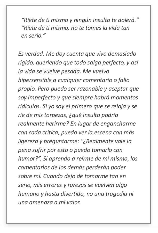 ANÁLISIS: "Es verdad. Me doy cuenta que vivo demasiado rígido, queriendo que todo salga perfecto, y así la vida se vuelve pesada. Me vuelvo hipersensible a cualquier comentario o fallo propio. Pero puedo ser razonable y aceptar que soy imperfecto y que siempre habrá momentos ridículos. Si yo soy el primero que se relaja y se ríe de mis torpezas, ¿qué insulto podría realmente herirme? En lugar de engancharme con cada crítica, puedo ver la escena con más ligereza y preguntarme: “¿Realmente vale la pena sufrir por esto o puedo tomarlo con humor?”. Si aprendo a reírme de mí mismo, los comentarios de los demás perderán poder sobre mí. Cuando dejo de tomarme tan en serio, mis errores y rarezas se vuelven algo humano y hasta divertido, no una tragedia ni una amenaza a mi valor."