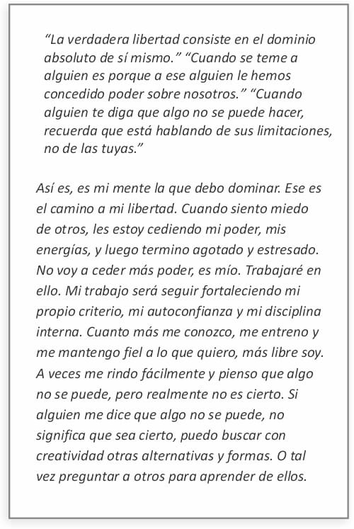 ANÁLISIS: "Así es, es mi mente la que debo dominar. Ese es el camino a mi libertad. Cuando siento miedo de otros, les estoy cediendo mi poder, mis energías, y luego termino agotado y estresado. No voy a ceder más poder, es mío. Trabajaré en ello. Mi trabajo será seguir fortaleciendo mi propio criterio, mi autoconfianza y mi disciplina interna. Cuanto más me conozco, me entreno y me mantengo fiel a lo que quiero, más libre soy. A veces me rindo fácilmente y pienso que algo no se puede, pero realmente no es cierto. Si alguien me dice que algo no se puede, no significa que sea cierto, puedo buscar con creatividad otras alternativas y formas. O tal vez preguntar a otros para aprender de ellos."