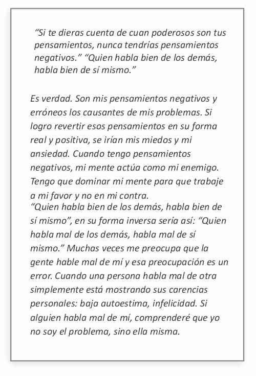 ANÁLISIS: "Es verdad. Son mis pensamientos negativos y erróneos los causantes de mis problemas. Si logro revertir esos pensamientos en su forma real y positiva, se irían mis miedos y mi ansiedad. Cuando tengo pensamientos negativos, mi mente actúa como mi enemigo. Tengo que dominar mi mente para que trabaje a mi favor y no en mi contra.